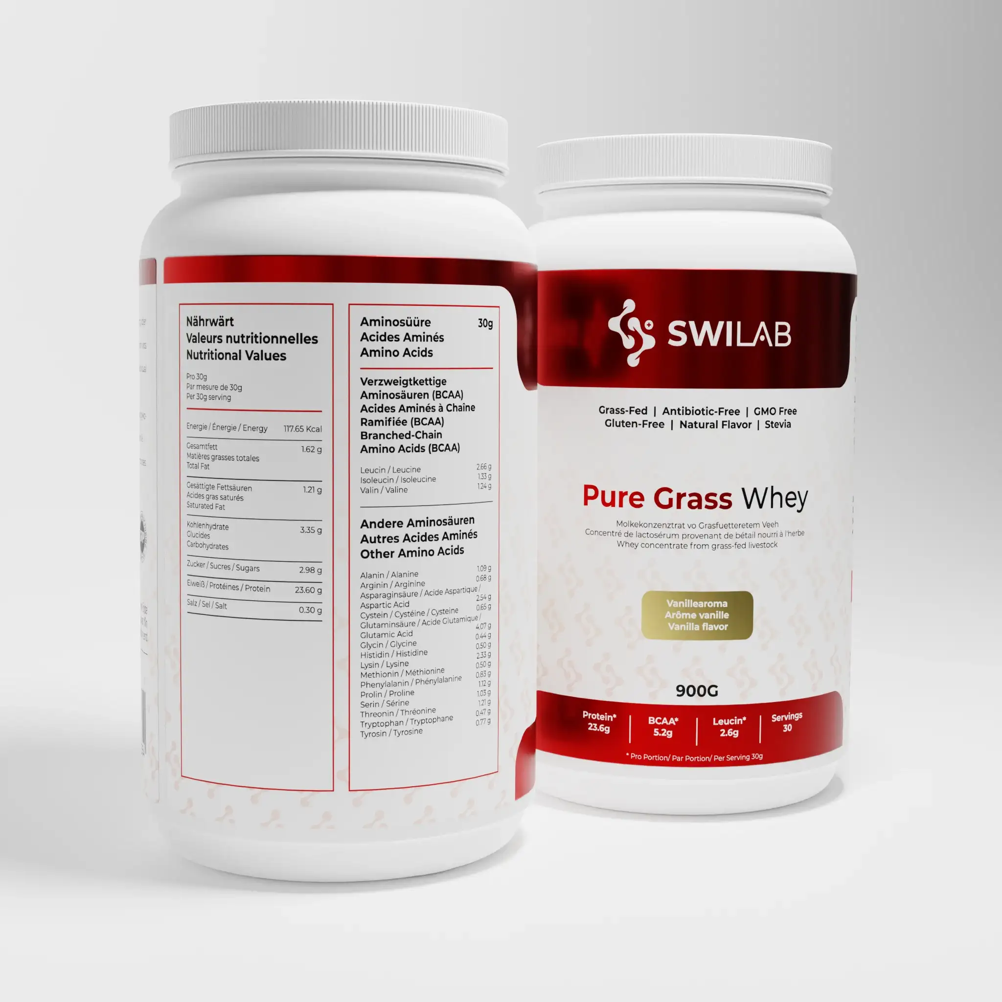 Comprendre les types de whey permet de choisir celle qui correspond le mieux à ses besoins et à son objectif. La whey concentrée est le format le plus courant : elle conserve une partie des lipides et du lactose du lait d'origine, avec une teneur en protéines d'environ 70 à 80 %. C'est le choix qui offre le meilleur rapport qualité-goût-prix. La Pure Grass Whey de Swilab appartient à cette catégorie, avec un concentré de lactosérum issu de vaches nourries à l'herbe, arômes naturels et stévia.